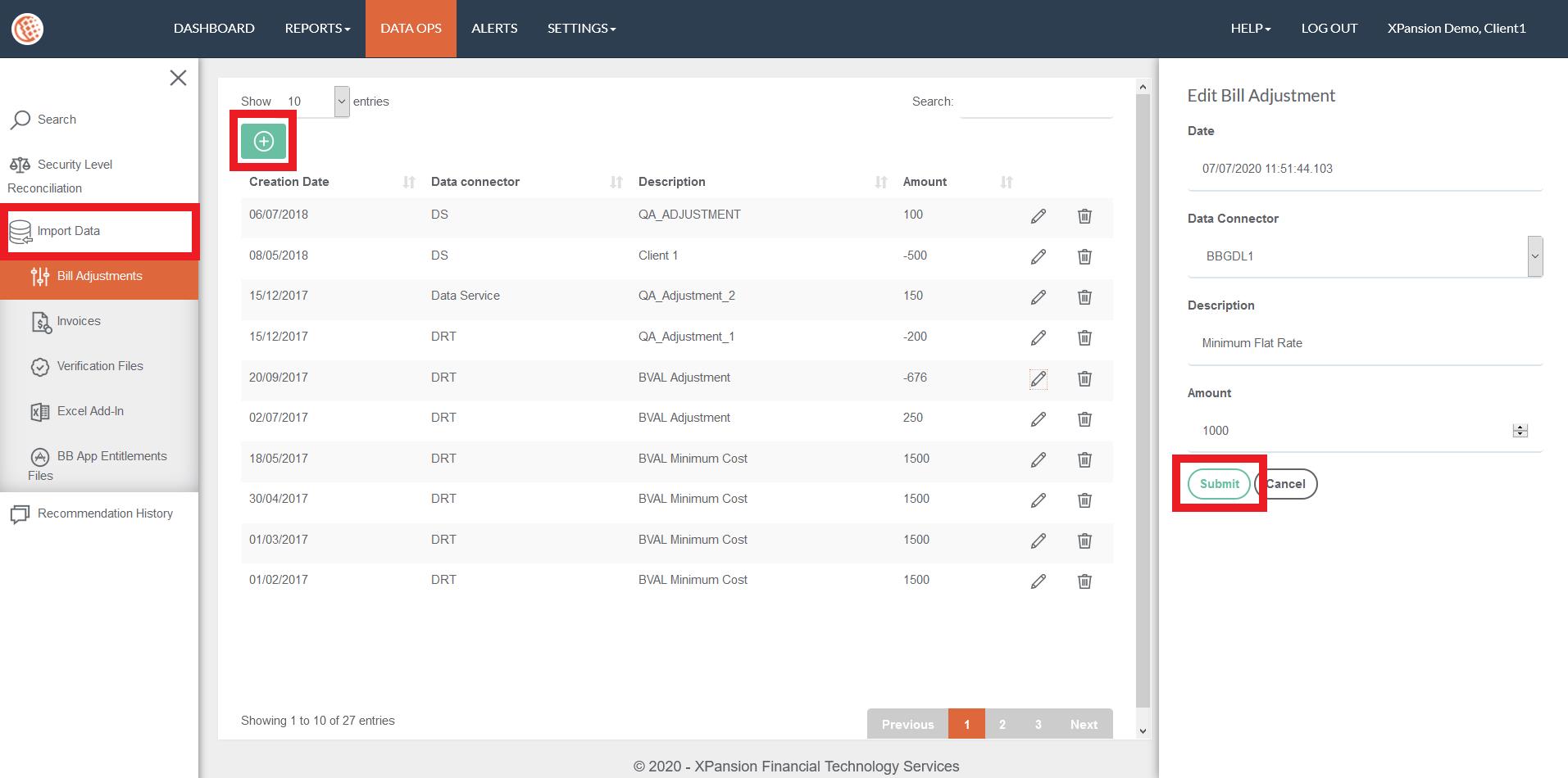 In order to define a new Bill adjustment, go to the menu ‘DATA OPS’> ‘IMPORT DATA’ > ‘BILL ADJUSTMENTS’, click on ‘Add New’ and populate the view as listed below: