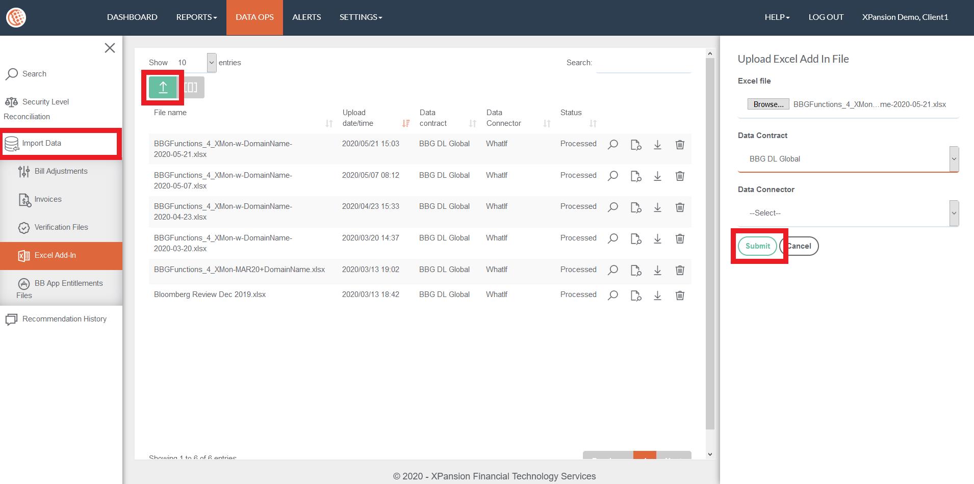 In order to access the Excel Add-In, you need to go to the menu ‘DATA OPS’ > ‘IMPORT DATA’ > ‘UPLOAD EXCEL ADD-IN’