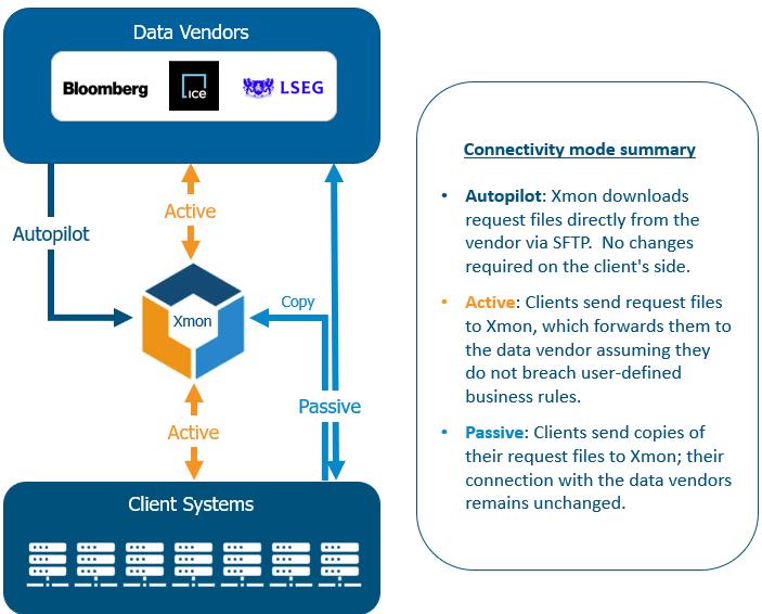 Xmon is a secure, high-performance cloud-based solution that requires no client-side installation. It operates by positioning itself strategically alongside or between your internal systems and market data providers to monitor all data requests and can apply intelligent controls in real-time. There are three ways of connecting with Xmon; Autopilot, Active and Passive. Each mode is described below.