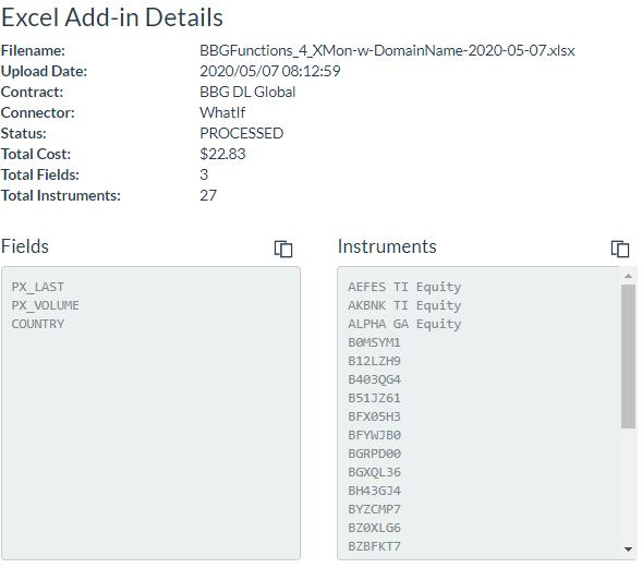 Excel Add-In Details. Providing details such as the filename, date, contract, connector, status, costs, fields and instruments
