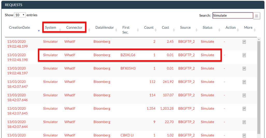 Simulate the cost of a request by clicking on the green arrow, selecting the right Connector and pasting the Request body. Click on Send and the request will be populated with the Status Simulate.