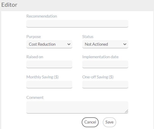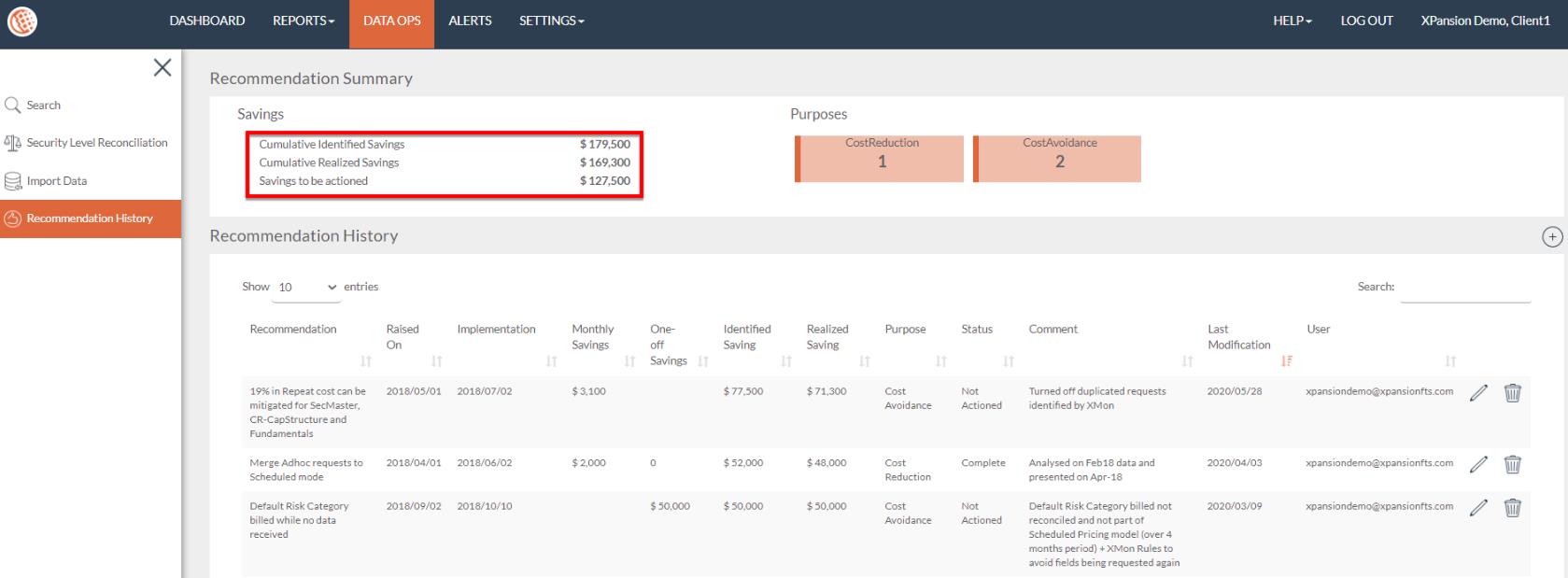 This provides the opportunity to set identified and realized savings in order to reduce future costs. It involves the creation and maintenance of a plan, such as the recommendation, purpose, status and comment. They are all explained by the actions that need to be taken from the client in order to achieve the pre-defined goals for cost reductions. Recommendation History can be found in ‘DATA OPS’ > ‘RECOMMENDATION HISTORY’