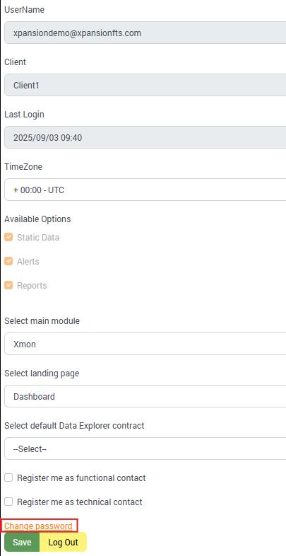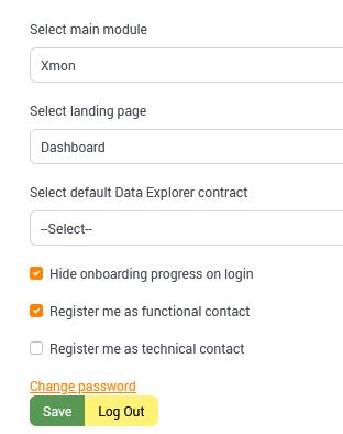 In the Account > My Account section, users can configure their main application upon login – Xmon or Xprocess , select their landing page – Dashboard or Data Explorer, register themselves as either Functional or Technical contact and change their password.