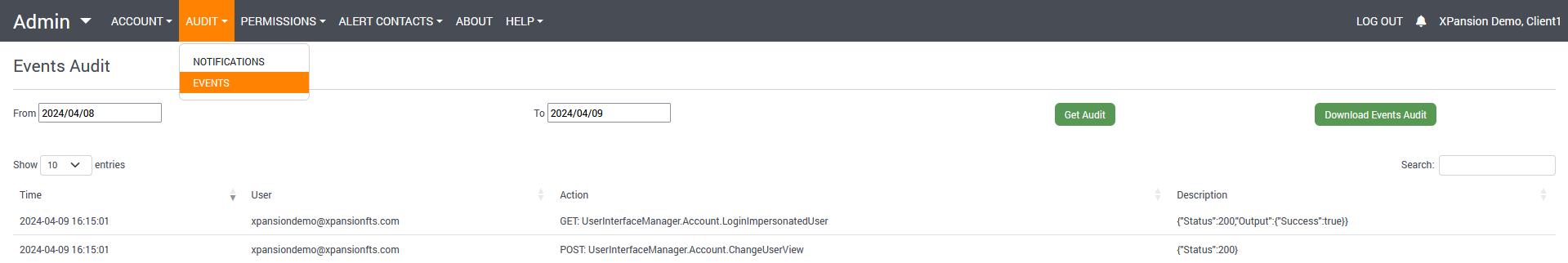 In Audit section, the user can view and download the Audit of Notifications and Events.