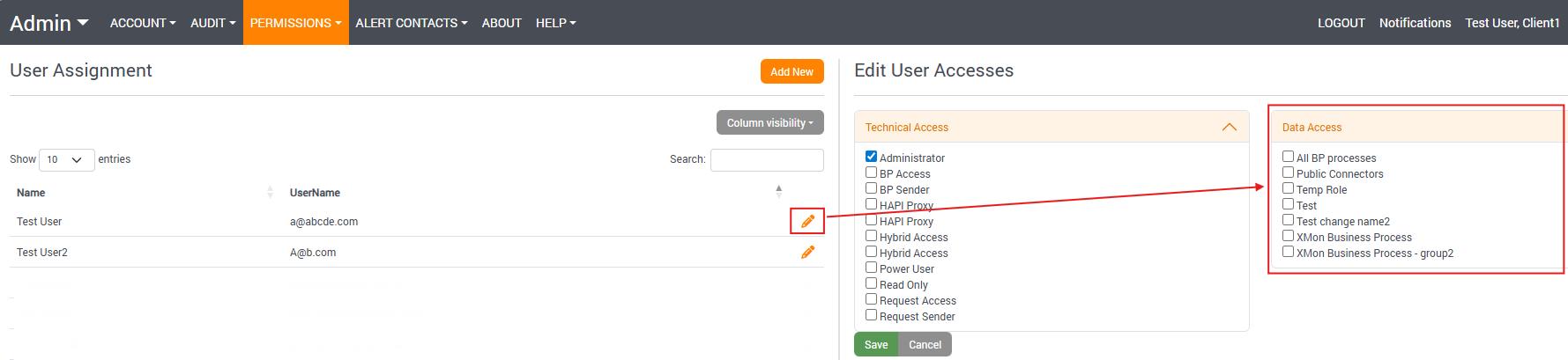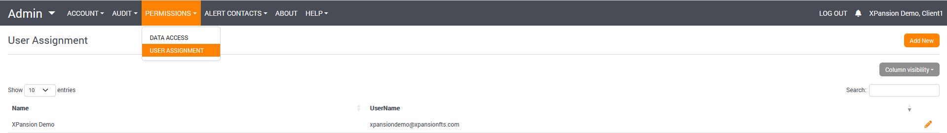 In the Permissions section, Administrators can manage data access as well as other users and their privileges in the User Assignment section: