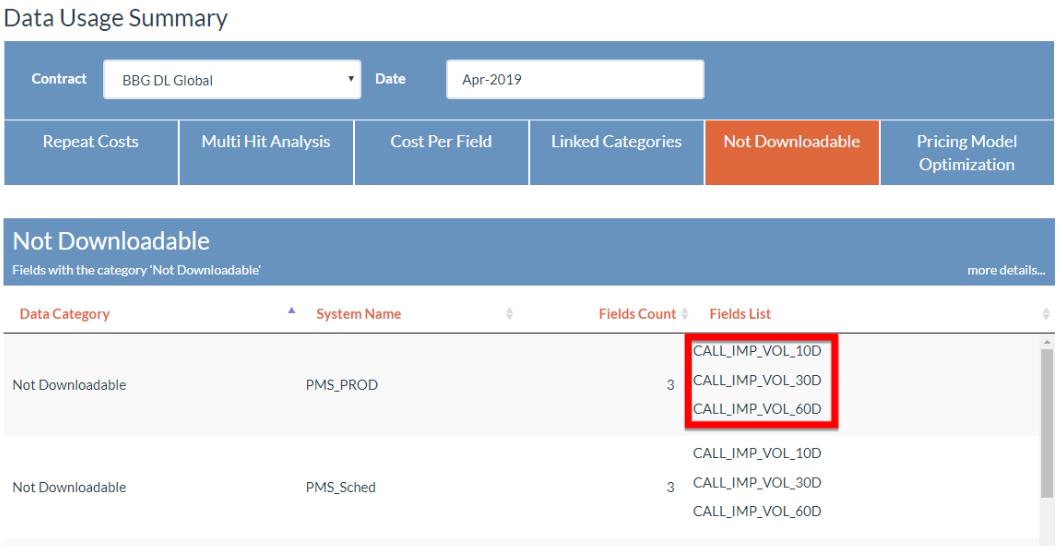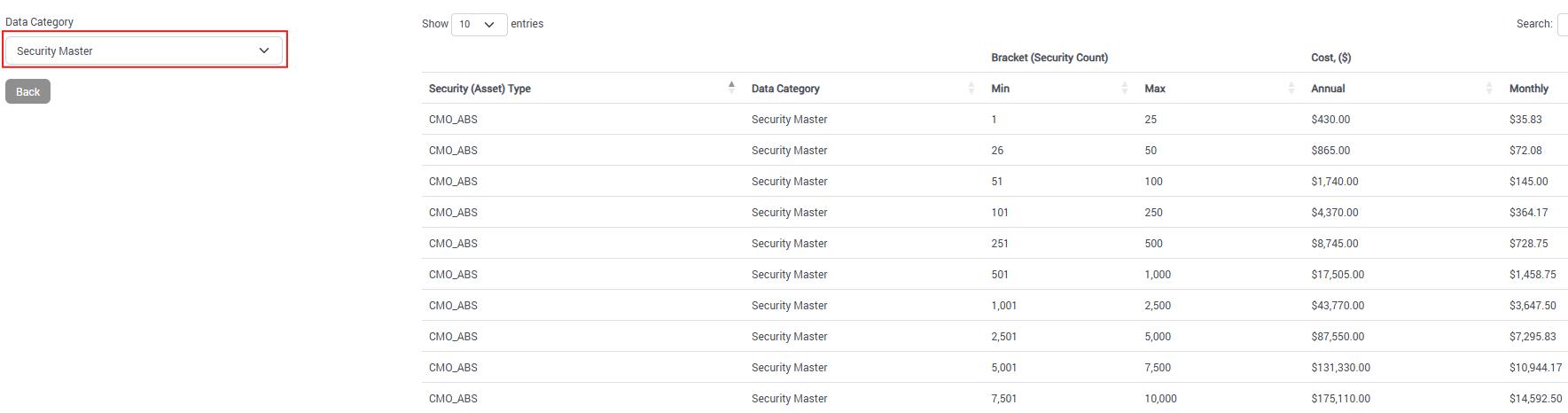 Select a Data Category from the drop-down list, at which point the pricing matrix will display with: