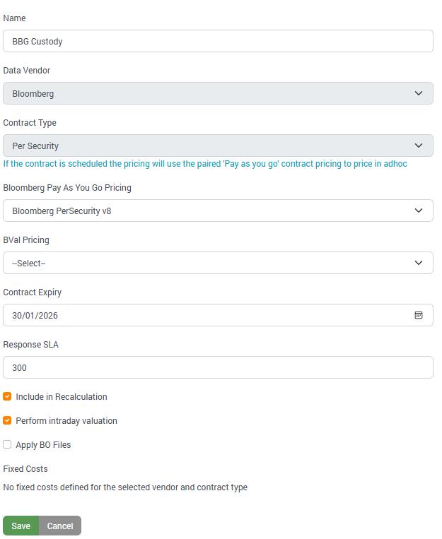 A Data Contract in Xmon represents the commercial agreement you have with a data provider (such as Bloomberg or Refinitiv). This configuration is essential because it defines how Xmon calculates costs, applies pricing models, and manages your vendor relationship within the system.