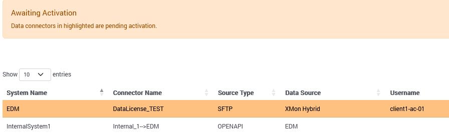 When a new Connector has been added, it will be highlighted in Orange and a message “Awaiting Activation” will be displayed in the Orange Banner until it has been activated by Xmon support team.