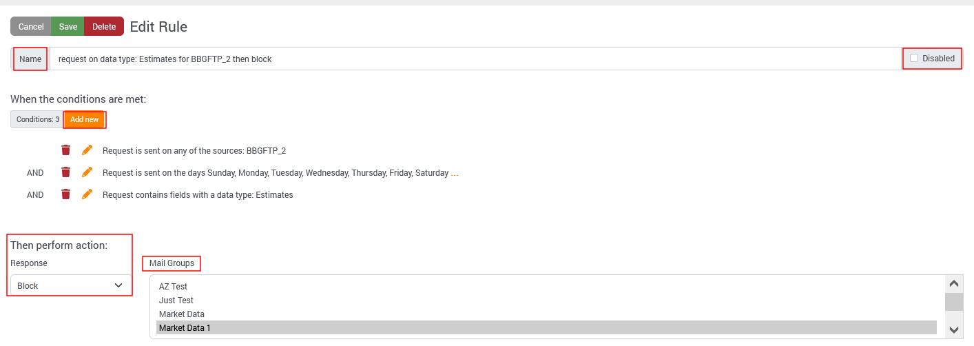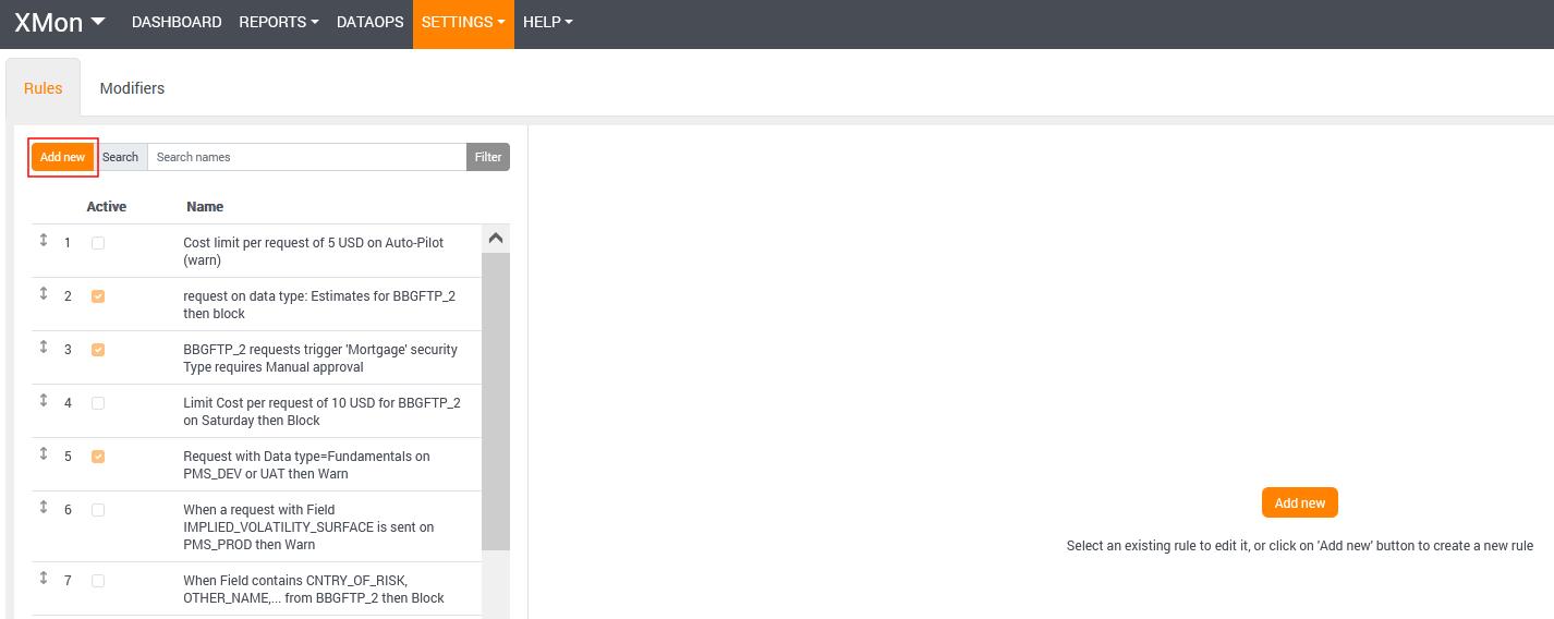 To define a new rule, go to the menu SETTINGS > RULES and click on the Add New button, input the required information and click Save when finished.