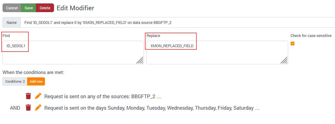 Example: As per the below snapshot, when the request includes the text “ID_SEDOL1” this will be replaced with the text “XMON_REPLACED_FIELD”.