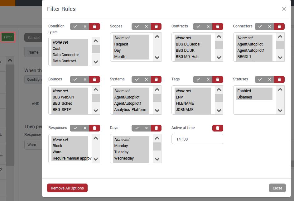 There is a range of multiple conditions you can set within a rule. Each rule needs to contain one condition on either Data Contract, Data Source, Data System or Data Connector. Below is a list and description of the conditions: