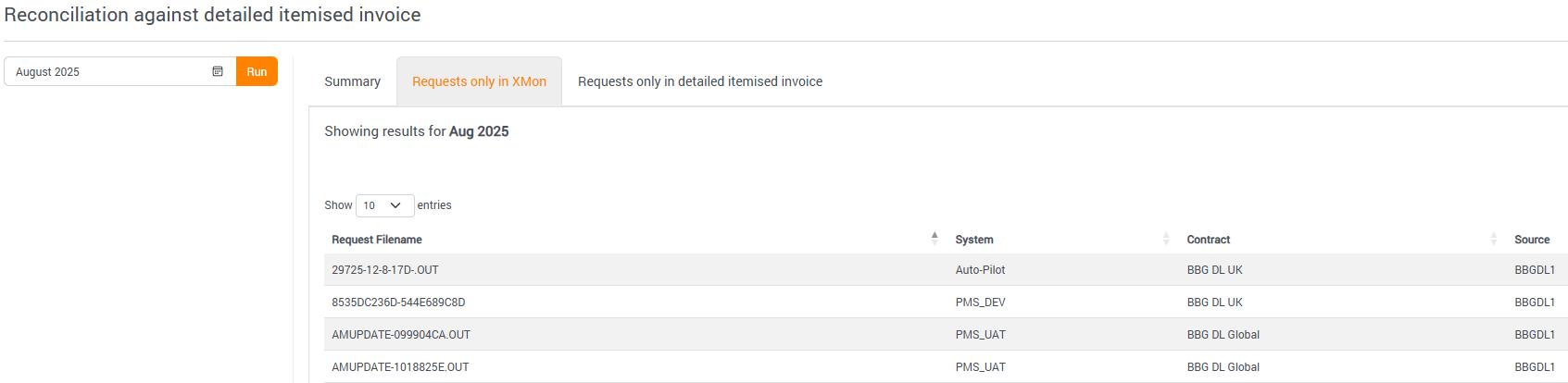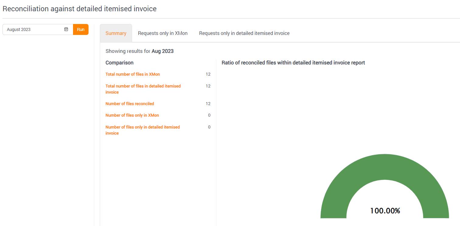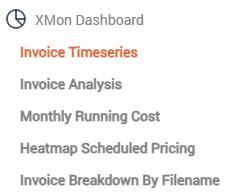 Once uploaded and processed, users can view the reconciliation report vs Xmon estimates in the menu ‘REPORTS’ > ‘INVOICE RECONCILIATION’. For more details refer to section Invoice Reconciliation Report.