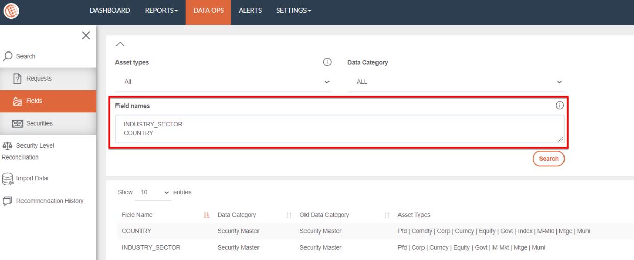 Note: The fields dictionary lookup feature is available in the menu DATA OPS > Search > Fields. It is updated overnight so new custom fields will only be able to be searched the day following the processing of a new custom fields.